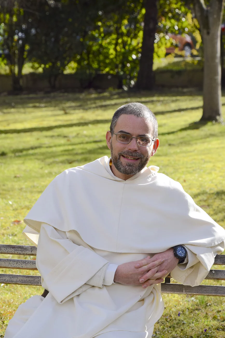 Portrait d'un moine dominicain souriant en habit blanc dans un jardin